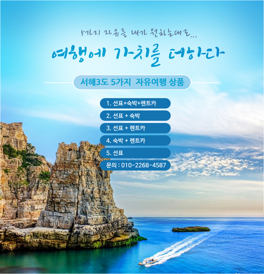 20년 이상의 경험을 토대로 고객 니즈에 맞는 맞춤식 서해3도(소청도, 대청도, 백령도) 상품을 운영하고 있습니다