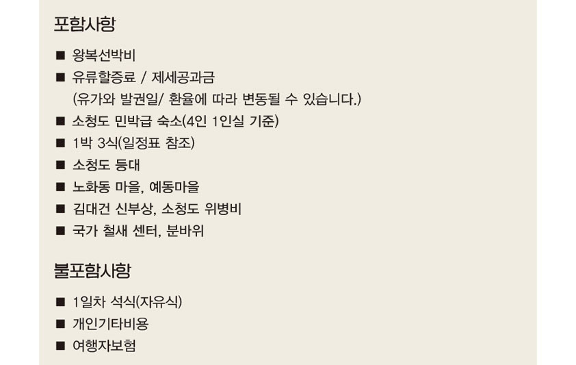 * 서해5도 할인(평일출발)은 1개월전 예산확인 후 예약가능합니다.
